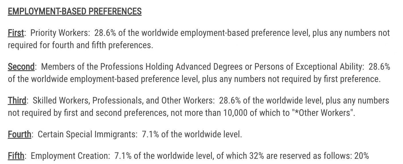 美国职业类移民主要共有五类,一般情况下各类别移民签证配额如下: